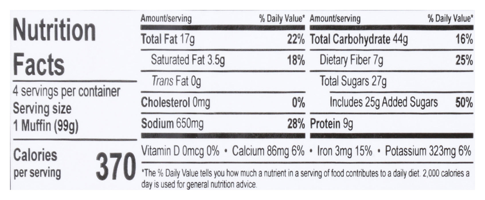 - 7g of fiber 9g of healthy protein 4350mg of omega 3's per Muffin.