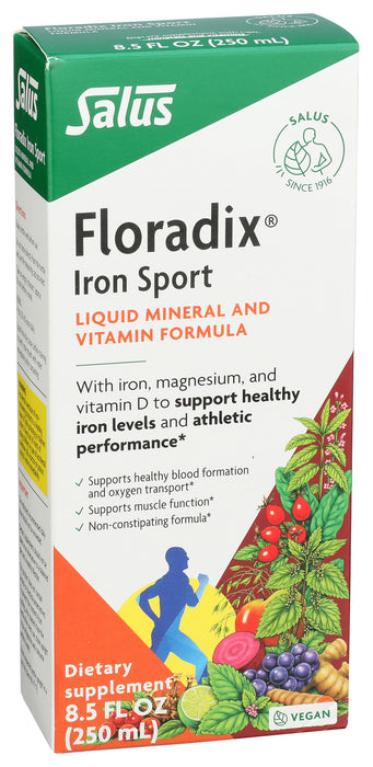 Floradix Iron Sport Liquid Mineral And Vitamin Formula is easily absorbed and gentle to digest. Athletes have an increased iron requirement due to high intensity training iron contributes to normal oxygen transport in the body and the normal formation of red blood cells and hemoglobin. Magnesium and vitamin D contribute to normal muscle function and support bone maintenance, whereas magnesium and zinc contribute to normal protein synthesis. Floradix Iron Sport is easy to take and helps safeguard the balance of iron and vitamins B1, B2, niacin, B6, B12, C and D, magnesium, zinc and copper. As these nutrients are already dissolved, they are absorbed more quickly by the digestive system compared to tablets. Floradix Iron Sport contains selected herbs and several fruit juice concentrates for a pleasant taste. *