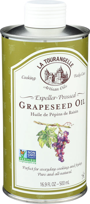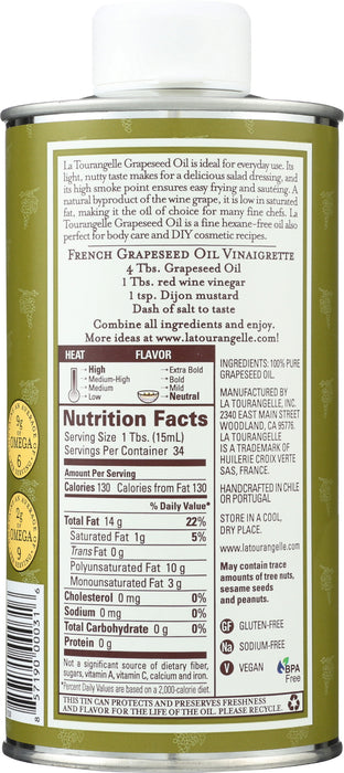 La Tourangelle Expeller-Pressed Grapeseed Oil is a the natural by-product of the wine grape extracted without the use of any chemicals. Our Expeller-Pressed Grapeseed Oil can be heated to 450 degrees for healthy cooking and frying and it's low in saturated fat content. There is a light flavor and our Grapeseed Oil is star-k kosher certified, non-GMO and it is perfect for everyday use. Expeller-Pressed Grapeseed Oil has a high level of polyunsaturated fat and contains an average of 9.8 g of omega-6 per serving. We use only 100% all natural, Grapeseed's in our Oil that comes in a 16.9 fl oz canister.