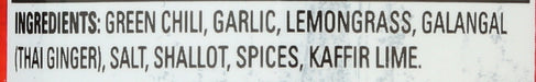 Thai Kitchen Green Curry Paste is made from green chili, garlic, lemongrass, galangal ( thai ginger ), salt, shallot, spices and kaffir lime. Each 1 tbsp serving in the 4 oz jar contains 15 calories, 2g of sugar, 0 fat, 3g of carbohydrates and 1g of dietary fiber. Our Green Curry Paste is gluten-free and vegan.