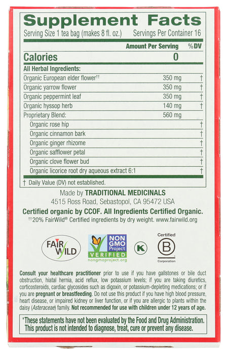 Traditional Medicinals Gypsy Cold Care Seasonal Tea Bags are made with certified kosher and verified non-gmo ingredients. Each box contains 16 tea bags of our naturally caffeine free herbal tea. Ingredients like elder flower, yarrow flower and peppermint leaf make this tea a comfort to a weary body and risks.