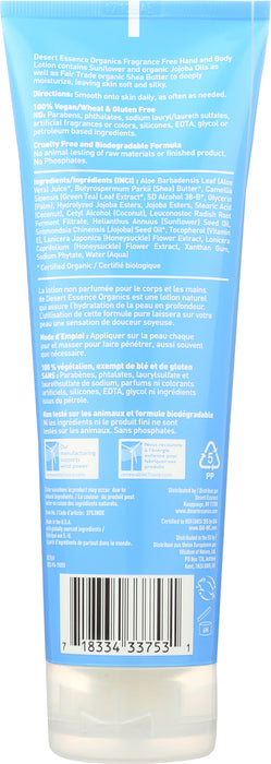 Desert Essence Organics Fragrance Free Soothing Hand and Body Lotion can be used daily to moisturize skin. made with sunflower and organic jojoba oils and fair trade organic shea butter, this lotion will deeply moisturize your skin leaving it soft and silky. Our lotion is 100% vegan, cruelty-free, biodegradable, and free of gluten and wheat. It is also free of parabens, silicone, and artificial fragrances. Each tube contains 8 fl. oz. of Desert Essence Organics Fragrance Free Soothing Hand and Body Lotion. See label for warnings.