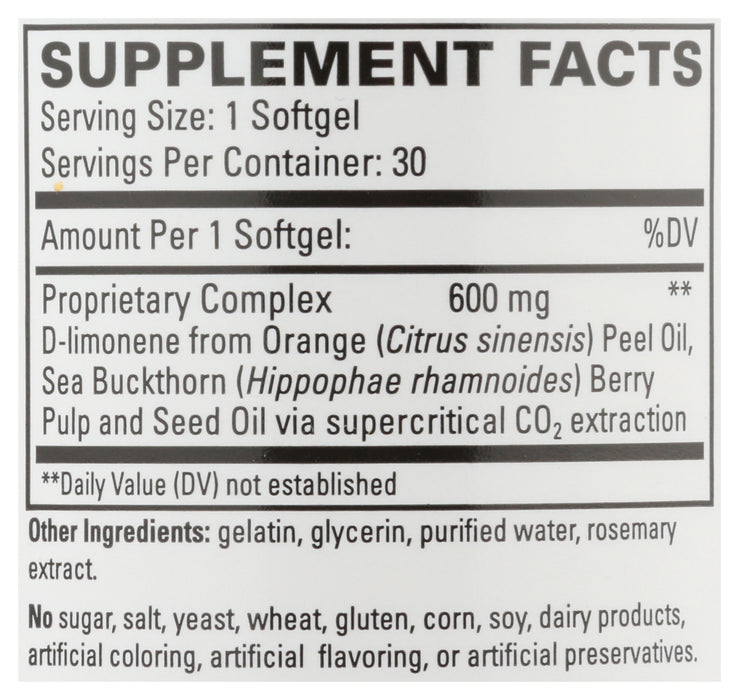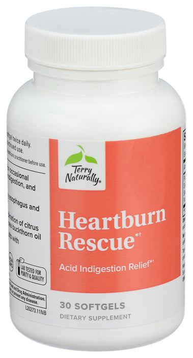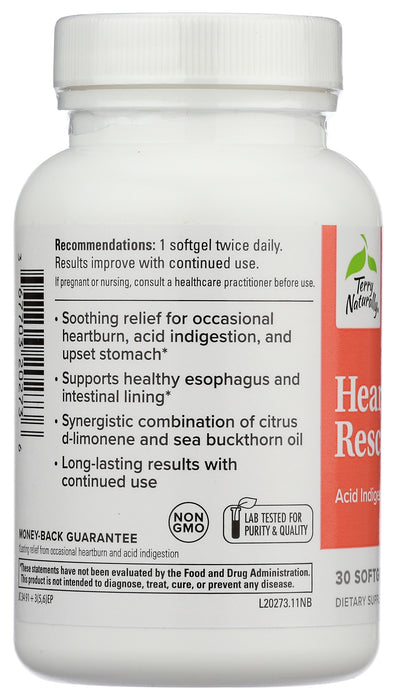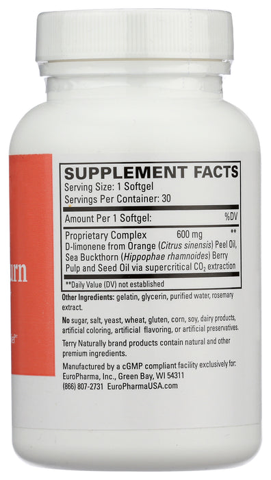 Terry Naturally Heartburn Rescue is a clinically studied component of citrus oil found in oranges, grapefruits, lemons, and limes. Although citrus fruits are typically associated with acidity, this compound of citrus oil actually relieves occasional heartburn and supports healthy peristalsis the muscle action of the intestines that moves food through the digestive system. Soothing relief for occasional heartburn, acid indigestion, and upset stomach,supports healthy esophagus and intestinal lining, synergistic combination. of citrus d-limonene and sea buckthorn oil long-lasting results with continued use. *
