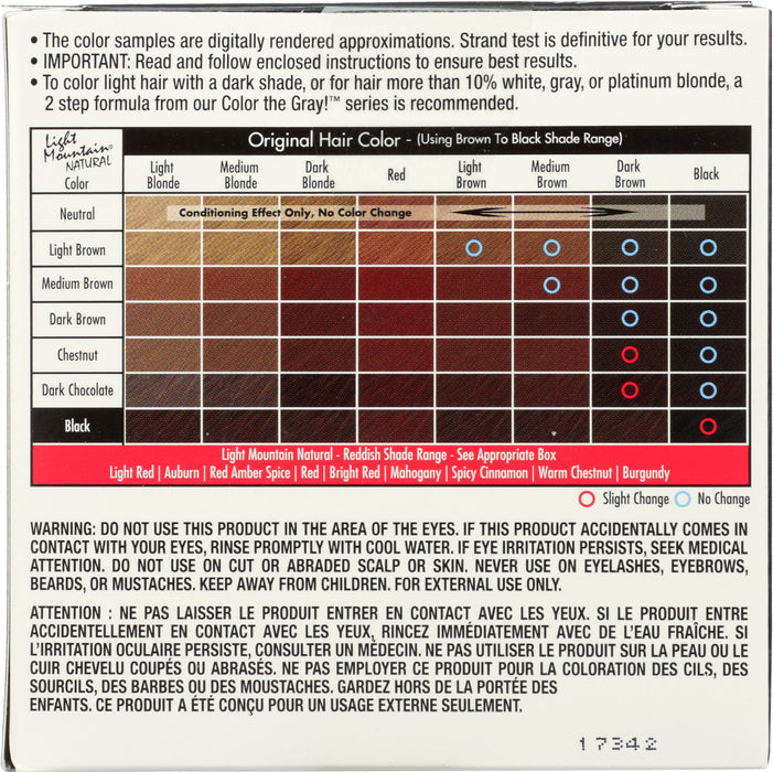 - One 4 oz box of Light Mountain Black Haircolor & Conditioner.