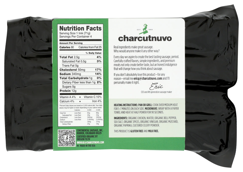 Charcutnuvo Organic Cooked Italian Chicken Sausage is made with organic, free-range and paleo-friendly chicken grown in the USA, organic bell peppers. An organic chicken sausage that will make any italian meal a little healthier. This non GMO chicken sausage has the rich flavors of italy so it naturally pairs well with italian pasta or soups. The hormone free chicken is a hearty and delicious organic alternative to pork, but the italian spices give it the unmistakable italian flavor.