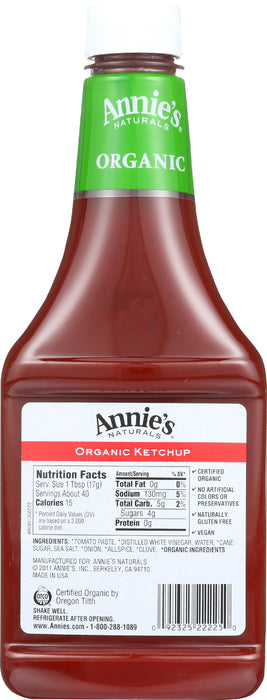 Annie’s Homegrown Ketchup is classically paired with everything from french fries and burgers to scrambled eggs and veggies everything tastes better with ketchup. It’s the perfect blend of tomato paste, distilled white vinegar and onion, delicately balanced with spices like sea salt, allspice and clove. Our dressing is gluten-free and USDA-certified organic and it’s vegan. Includes one 24 oz bottle of Annie's Homegrown Ketchup. Annie’s has a commitment to bettering the world through nourishing foods, honest words and conduct that is considerate and kind.