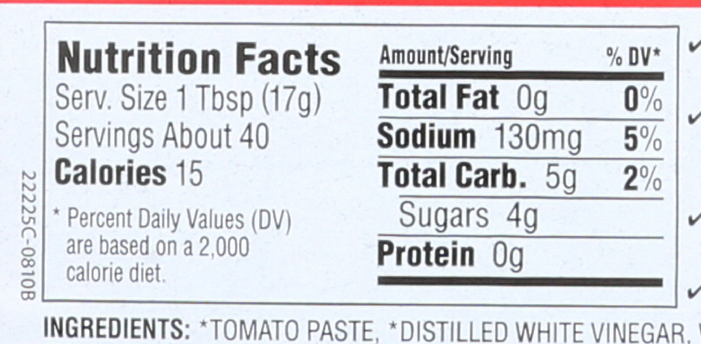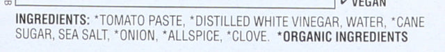 - Ingredients include tomato paste, distilled white vinegar, onion, allspice and clove.