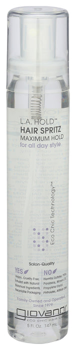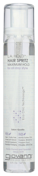 Giovanni Hair Spray Hold Hair Spray is a stellar product you can count on. It is made without any testing on animals, and is vegetarian. It doesn't contain any dyes, parabens or other harmful chemicals, including pegs. Each bottle contains 5 fl. oz of Hair Spray.