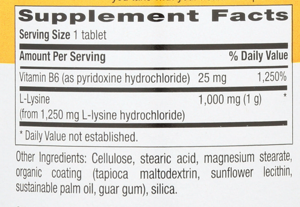 Country Life L-Lysine Dietary Supplement include 1,000 mg of this essential amino acid per tablet to support collagen functioning and renewal in the skin, mouth and lips. Each tablet in this 100 count bottle also has 25 mg of vitamin B6 to improve L-Lysine utilization in the body. this non-GMO Dietary Supplement is certified vegan and contains no wheat, soy, yeast, milk, sugars, salt or preservatives to make allergen avoidance and maintaining dietary restrictions simple. *
