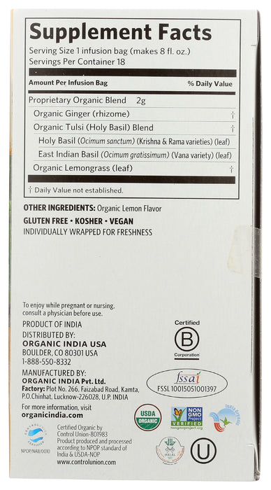 Organic India Tulsi Tea, Lemon Ginger, 18 bag