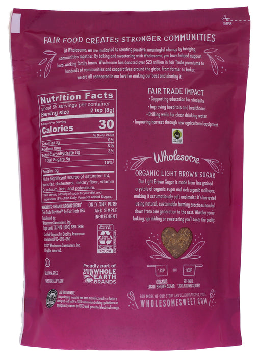 Wholesome Organic Fair Trade Light Brown Sugar is a perfect one-for-one replacement for conventional light brown sugar. Its subtle and warm caramel flavor makes it ideal for cakes and pies. Wholesome organic fair trade light brown sugar also tastes amazing on carrots, oatmeal, baked beans, ribs and mixed in coffee. Organic Light Brown Sugar our light brown sugar is made from fine grained crystals of organic sugar and rich organic molasses, making it scrumptiously soft and moist.