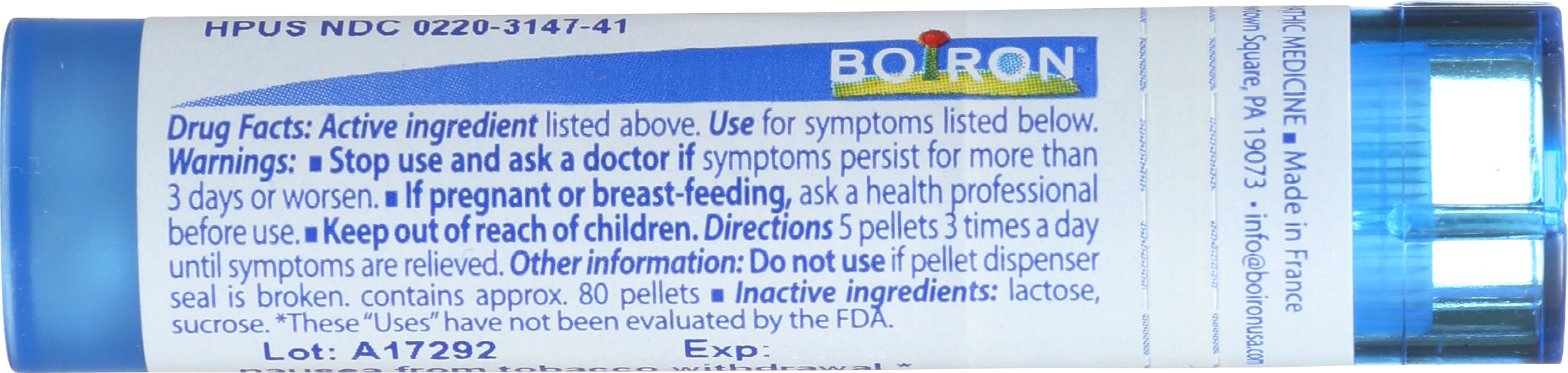 Boiron Lobelia Inflata Medicine is made from all-natural ingredients to help reduce tobacco cravings. This holistic medication is also commonly called indian tobacco. Adults and children 2 years of age and older should dissolve five tablets under the tongue at least three times a day to relieve symptoms. The tablets contain lactose and sucrose for a sweet taste. Each tube holds approximately 80 pellets. *