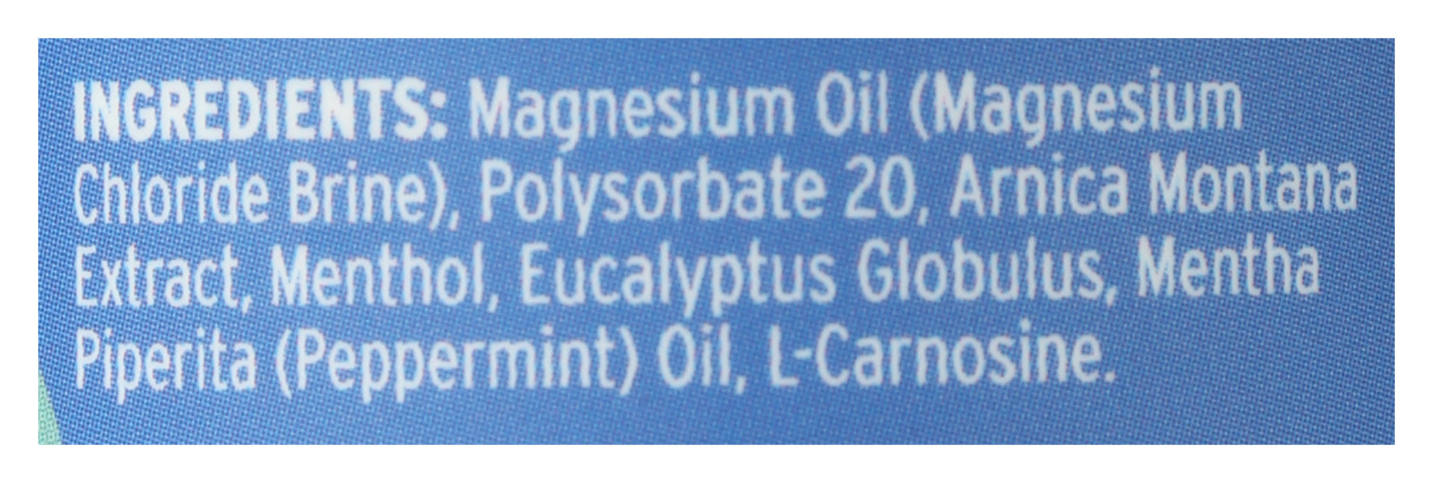 Magnesium Oil from the zechstein seabed in the netherlands provides highly concentrated pure Magnesium chloride that is non greasy. Formulated with menthol, arnica montana extract, eucalyptus oil and peppermint oil to help soothe and moisturize the skin for an active lifestyle.