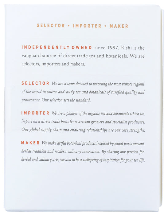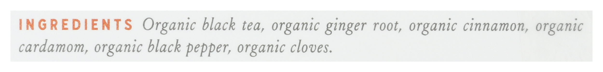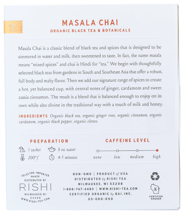 Rishi Tea Retail Tea Sachet, Masala Chaii is an organic black tea made from such natural ingredients as ginger root, cinnamon, black pepper, cloves and cardamom. Each box of 15 tea bags is certified usda organic, non-GMO and kosher. unlike common paper tea bags that tend to strip away the flavor and aroma of tea, our novel knit material provides a truer infusion for an aromatic, full-bodied cup.