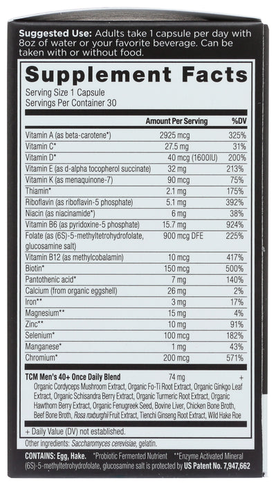 Ancient Multivitamin - Men's 40+ Once Daily Capsules are ancient TCM (Traditional Chinese Method) with body-ready vitamins and minerals in body-friendly, absorbable forms. Ancient Multi Men 40+ Once Daily features a potent combination of energy-promoting, heart-supporting and brain-supporting herbs, superfoods and body-ready vitamins in just one capsule per day. *