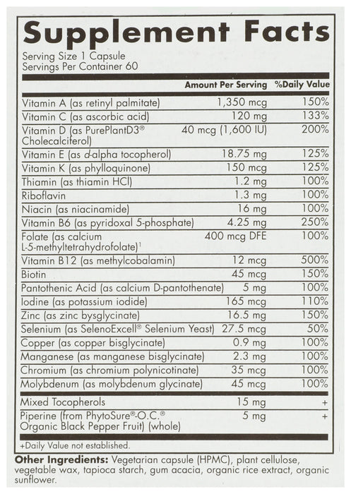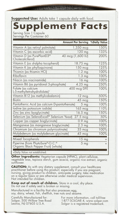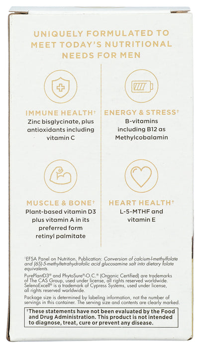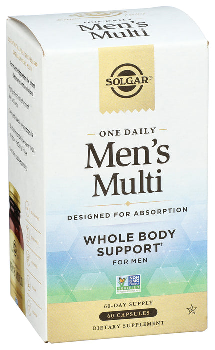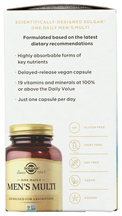 Solgar One Daily Mens Multivitamin is uniquely formulated to meet today's nutritional needs for men immune health zinc bisglycinate, plus antioxidants including Vitamin C energy & stress B-Vitamins including B12 as methylcobalamin muscle & bone plant-based Vitamin D3 plus Vitamin A in its preferred form retinyl palmitate heart health L-5-MTHF and Vitamin E. *