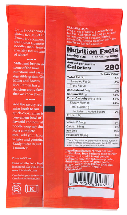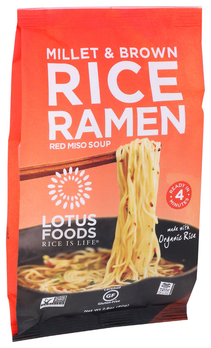 Lotus Foods Millet & Brown Rice Ramen With Miso Soup cooks in just four minutes for a fast, tasty meal or snack. Each 2.8 oz packet has 25% less sodium than regular ramen to keep your eating plan on track. We use organic rice and non-gmo ingredients to create a healthy, vegan soup that's low in fat and a significant source of fiber.