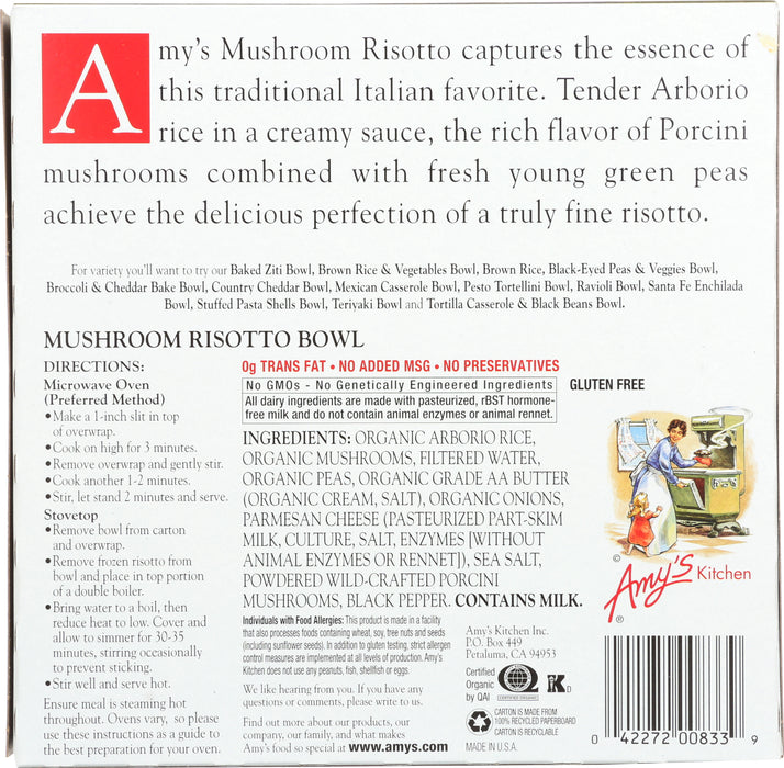 Amy's Mushroom Risotto Bowl, Gluten Free is a tender, organic Arborio rice meets the rich flavor of mushrooms and young green peas in a delectable creamy sauce. This is perfectly cooked risotto the easy way.