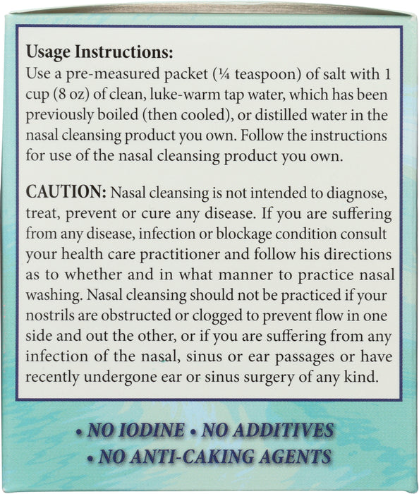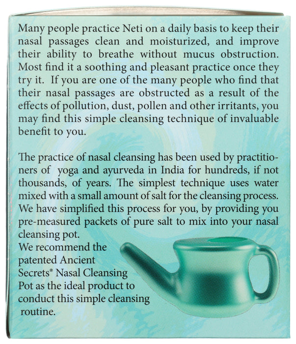 Ancient Secrets Nasal Cleansing Salt Non-iodized Pure Salt for the practice of nasal cleansing and moisturizing of nasal passages also known as "Neti" this premeasured salt may be used with any brand of nasal cleansing pot or nasal saline rinse squeeze bottle Contents.