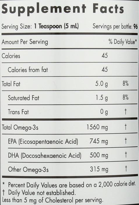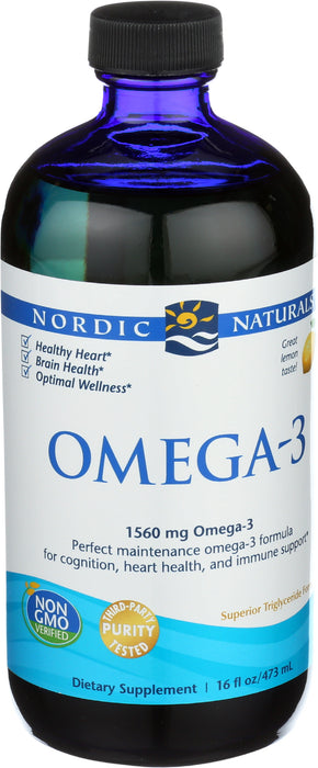 Nordic Naturals 1560 mg Omega-3 Liquid Dietary Supplement comes in a superior triglyceride form and is formulated to support heart health, immunity and cognition. Purity tested by a third party, our formula is made from wild-caught deep sea fish and has a delicious lemon taste. This supplement contains a blend of beneficial compounds including 745 mg of EPA, 500 mg of DHA and 315 mg of other Omega-3s to support your healthy nutrition and general well-being. Each 16 fl. Oz. Tamper-evident bottle provides 96 servings. Take one 1 tsp. Serving daily with a meal or as recommended by your doctor. *