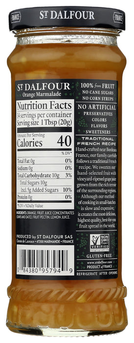 St. Dalfour Fruit Spread Blackcurrant traditional orange marmalade with a superb flavor complete with a noticeable tartness. Pairs well with chocolate, gouda and homemade biscuits.