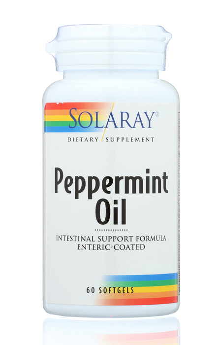 Solaray Peppermint Oil Dietary Supplement Softgels each contain 250 mg of natural, effective peppermint oil, in addition to rosemary, thyme, and chamomile oil. Intended to support intestinal function when taken as part of a healthy diet, these simple enteric-coating Softgels are packed with healthy, plant-based ingredients. This bottle contains 60 Peppermint Oil Dietary Supplement Softgels, which are designed to be taken daily. *