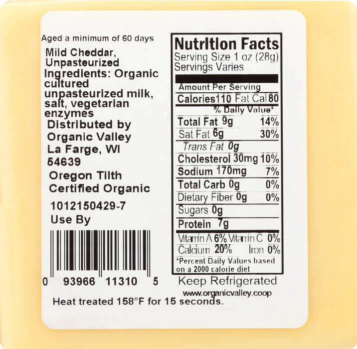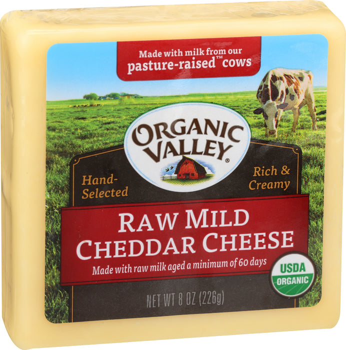 Organic Valley Cheddar Cheese, Raw Mild Cheddar is a delicious addition to your favorite recipes. This product is aged a minimum of 60 days and made with milk from pasture-raised cows. Organic valley cheddar cheese, raw mild cheddar is rich and creamy, comes packaged for convenience and contains 8 oz of product.