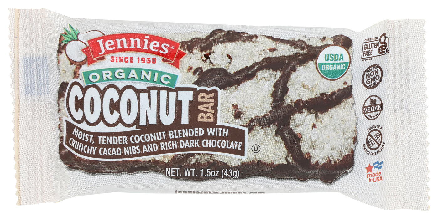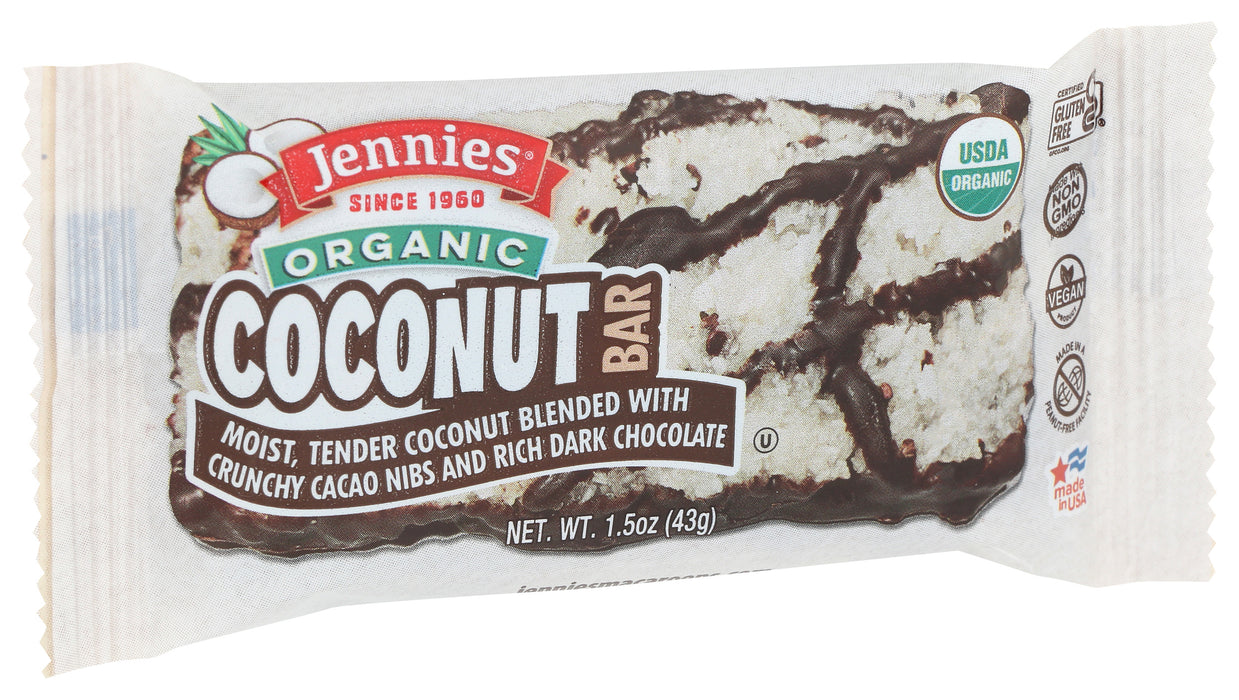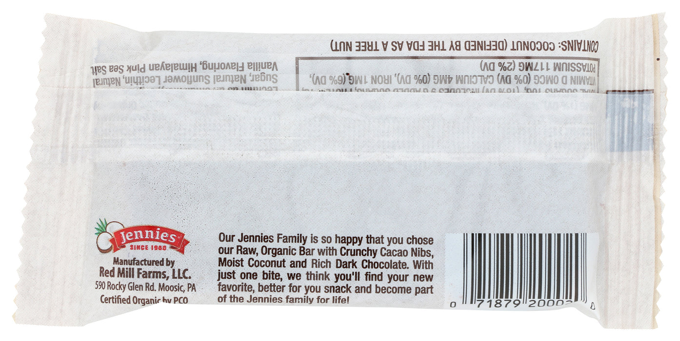Jennie's raw organic Cacao Coconut bars put a new spin on an old favorite by creating a coconut meets cacao nib power snack. Since 1960, jennie's has been making delicious Coconut treats. Each 1.5 oz. Bar has 190 calories and is gluten-free and non-gmo. Enjoy our wholesome bars anytime you crave a rich chocolatey snack with a dose of bourbon vanilla and crunchy sea salt. Contains tree nuts ( coconut ), see nutrition panel for allergen information.