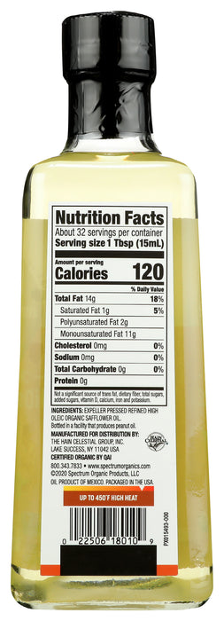 Spectrum Naturals Expeller Pressed Safflower Oil is perfect for your high heat cooking and frying needs. Certified kosher, non-GMO, our refined high heat oil is Expeller Pressed from specially cultivated seeds. This refined high oleic Safflower Oil has a neutral flavor and a high smoke point that makes the taste of any dish superb. Includes one 16 oz bottle of cholesterol and trans-fat free Spectrum Naturals Expeller Pressed Safflower Oil.