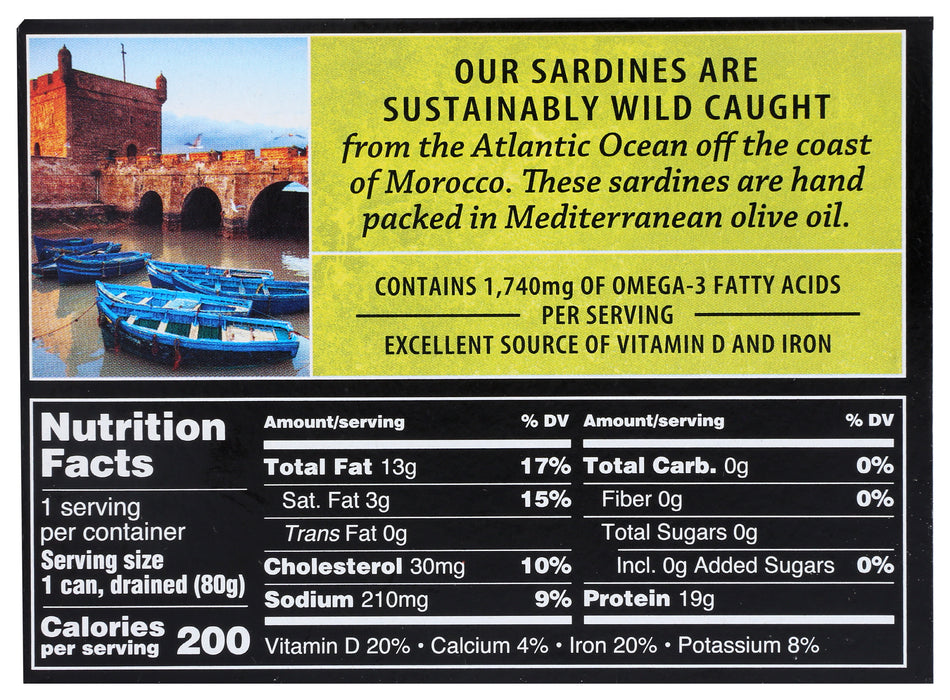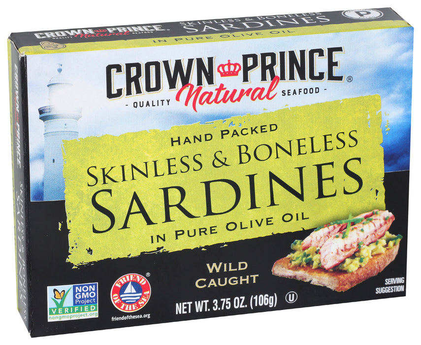 Crown Prince Sardines, Skinless & Boneless are wild-caught and ready-to-eat sardines that have been hand packed in pure olive oil. These kosher and non-GMO sardines are packed at the peak of freshness and they are a good source of omega-3 fatty acids. Try these delicious sardines on sandwiches, in soups, pastas, sauces and more. The exceptional taste of these sardines makes them a perfect addition to every kitchen. Each boxed can of Crown Prince Sardines, Skinless & Boneless contains 3.75 oz of product.