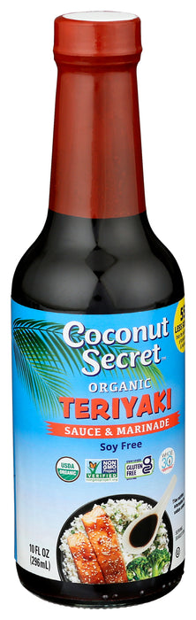 Coconut Secret Coconut Aminos, Teriyaki Sauce is a delicious product that does not have a coconutty flavor. When the Coconut tree is tapped, it produces a highly nutrient-rich "sap" that exudes from the Coconut blossoms. this sap is very low on the glycemic scale and contains a wide range of minerals--vitamin c, broad-spectrum b vitamins, 17 amino acids--and has a nearly neutral ph. our certified organic Teriyaki Sauce made from this natural sap starts with our own original Coconut aminos and nectar infused with aromatic spices, creating the first ever soy-free teriyaki sauce for all your asian-style cuisine. This sauce comes in a 10 oz. bottle. See the nutrition facts panel for allergens.