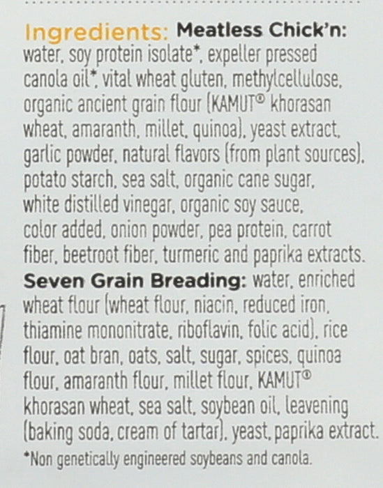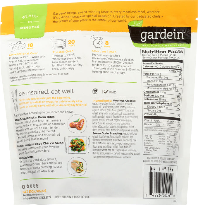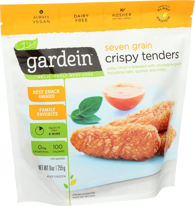 Gardein Crispy Tenders, 7 Grain are made with plant protein and ready in minutes. These meatless chick’n tenders are breaded with wholesome grains and are vegan, kosher and do not contain cholesterol. Add these delicious crispy tenders to salads or wraps or serve with dips. Each bag of gardein crispy tenders, 7 grain contains 9 oz of product.