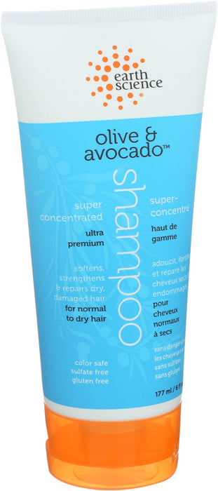 Earth Science Shampoo, Olive & Avocado is a super-concentrated, color-safe shampoo that softens, strengthens and repairs dry, damaged hair. Perfect for normal to dry hair, this Shampoo makes hair softer, thicker and more manageable. this gluten-free shampoo has not been tested on animals and it does not contain parabens or sulfates. Each tube of Earth Science Shampoo, Olive & Avocado contains 177 ml of product.