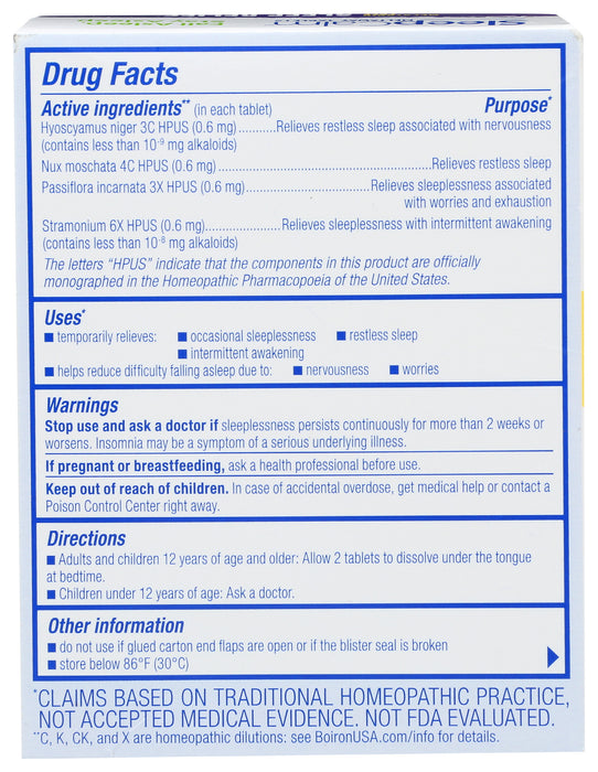 Boiron SleepCalm Sleeplessness Uses temporarily relieves occasional Sleeplessness, restless sleep, intermittent awakening, helps reduce difficulty falling asleep due to: nervousness, worries claims based on traditional homeopathic practice, not accepted medical evidence. Not FDA evaluated.