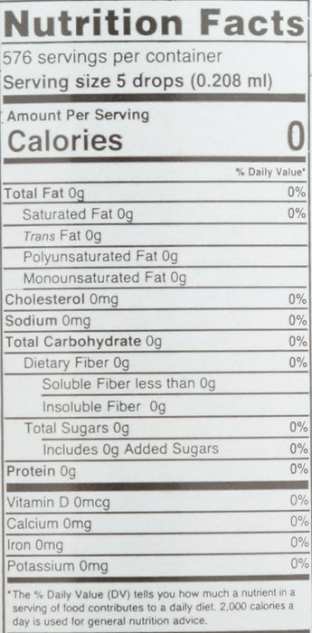 Sweetleaf Steviaclear Liquid Stevia is an all-natural, zero calories and zero carb sweetener made from stevia leaves. With a serving size of only about 5 drops ( or to taste ) to an 8 oz. glass, you'll get as many as 576 servings in this 4 fl. oz. bottle. It's healthy, diabetic-friendly and contains no bitterness or aftertaste.