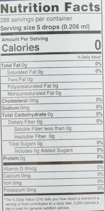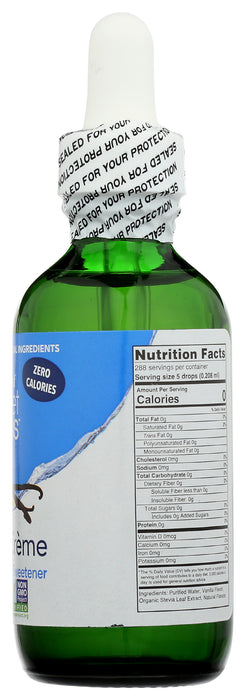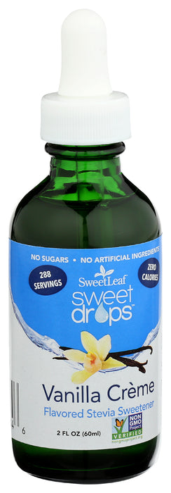 Sweetleaf Sweet Drops, Vanilla Creme Liquid Stevia is an all-natural, zero calories, zero carbs sweetener. With a serving size of only about 5 drops (or to taste) to an 8 oz. glass, you'll get as many as 288 servings in this 2 fl. oz. bottle. Ingredients include organic stevia leaf extract, purified water, vanilla extract and natural flavors.