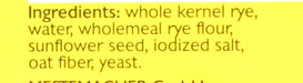 Mestemacher's Ready To Eat Sunflower Seed Bread With Whole Rye Kernels is a whole-grain bread with no artificial preservatives or cholesterol. Each 17.6 oz loaf has about 7 servings of natural sunflower seed bread with whole rye kernels. Our bread is freshly ground in our own mill from whole grains and ideal for a cholesterol conscious diet.