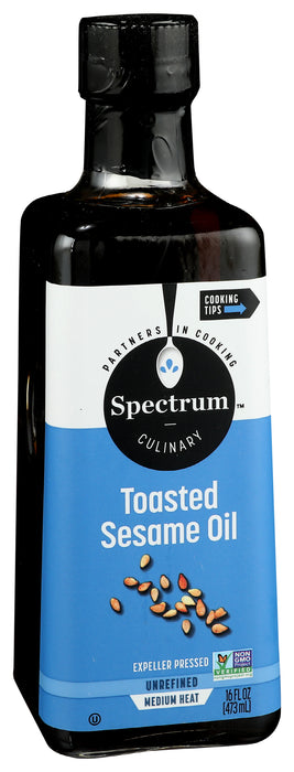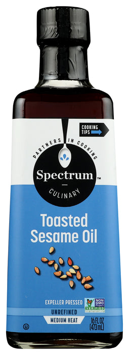 Spectrum Naturals Expeller Pressed Toasted Sesame Oil is perfect for medium heat cooking as well as salad dressing. This unrefined Sesame Oil has a roasted nutty flavor that lends itself to sauces and salad dressings, or sauteing at medium heat where the oil's full flavor is intended as an integral part of the finished dish. A non-hydrogenated fat food, our Sesame Oil is certified kosher and non-gmo. Includes one 16 oz bottle of cholesterol and trans-fat free Spectrum Naturals Expeller Pressed Toasted Sesame Oil.