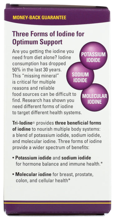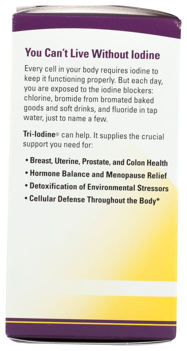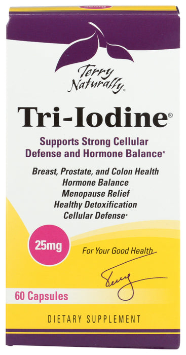 Terry Naturally Tri-iodine Dietary Supplement contains three different forms of iodine to help provide nourishment to key systems in your body. The Tri-iodine formula helps support breast, uterine, colon, and cellular health and helps maintain a balance of hormones in the body to provide relief from menopause symptoms. Take one tablet once a day with food for best results. Each box contains 90 capsules.12.5mg of iodine per capsule. *