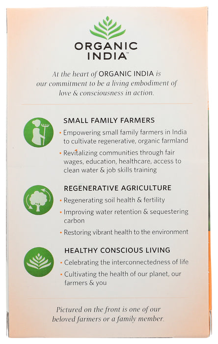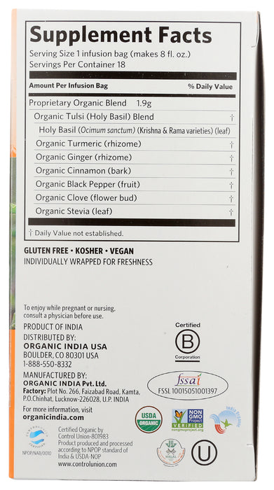 Organic India Usa Tulsi Tea, Turmeric Ginger is a natural and delicious tea formulated to promote an enhanced life. made with natural ingredients, this tea is pure and free of unnatural and unnecessary additives. This product is gluten-free, kosher and non-GMO. Each box of Organic India Usa Tulsi Tea, Turmeric Ginger, contains 18 tea bags.