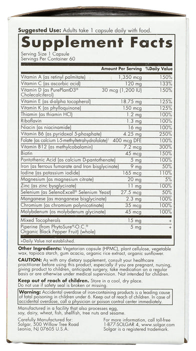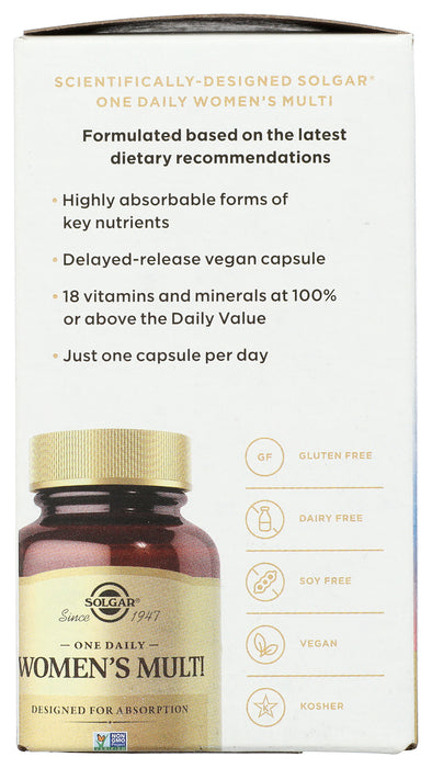 - Scientifically-designed Solgar One Dily Women's Multi formulated based on the latest dietary recommendations, highly absorbable forms of key nutrients, delayed-release vegan capsule, 18 Vitamins and minerals at 100% or above the daily value